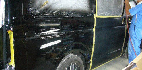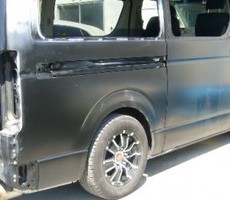 当社までお車をお持ち込みいただき、無料で台車の貸し出しをさせていただきました。右スライドドアと右リヤフェンダーを交換作業になります。リヤバンパー・ガラス・リヤゲート・タイヤ・内張り等、脱着作業が必要です。お預かりから納車まで、12日での施工となりました。 |